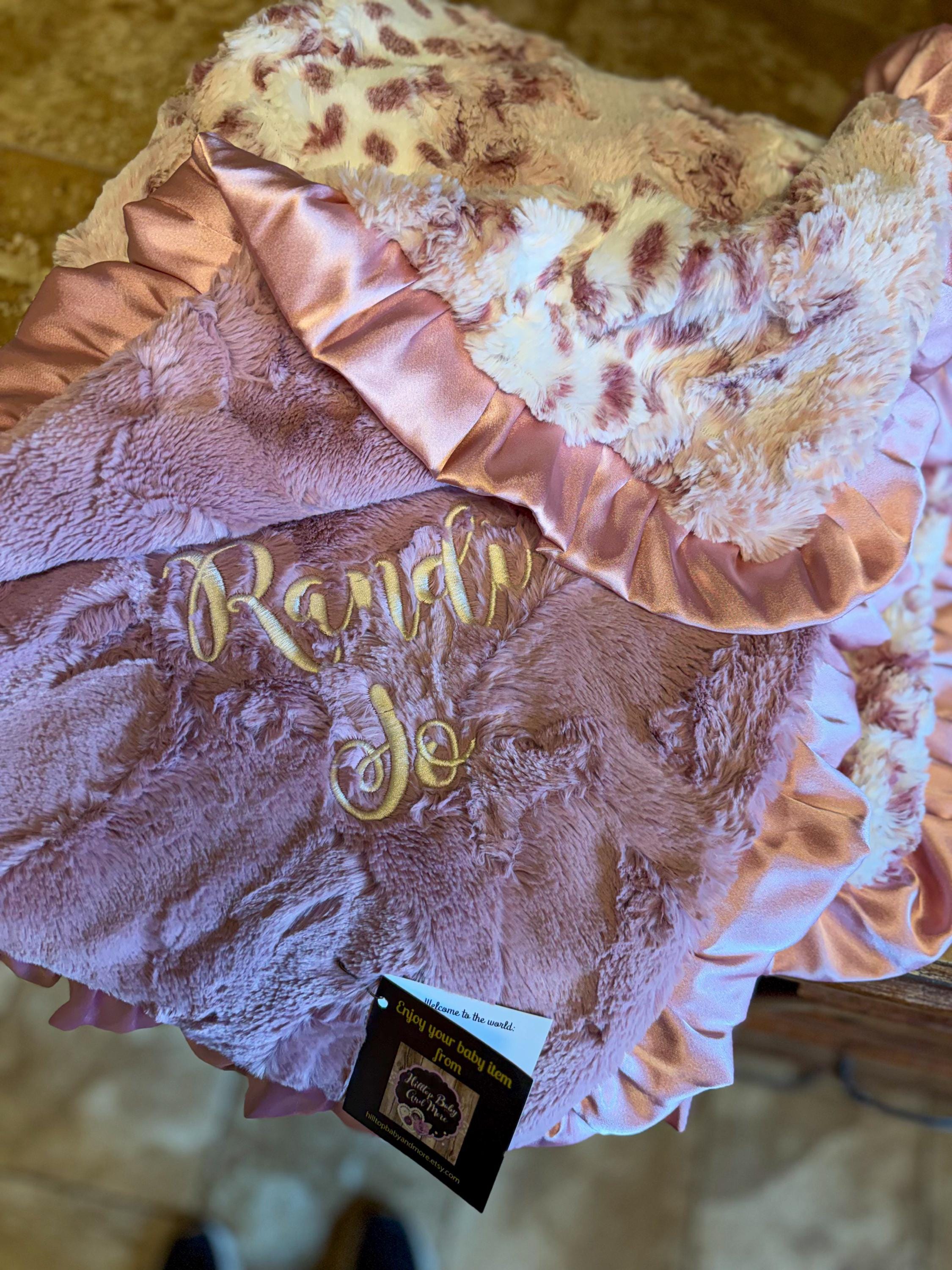 This personalized handmade minky baby blanket with name is a pink customized baby blanket for a girl. Soft and perfect for a newborn, it's a wonderful personalized baby girl gift idea.