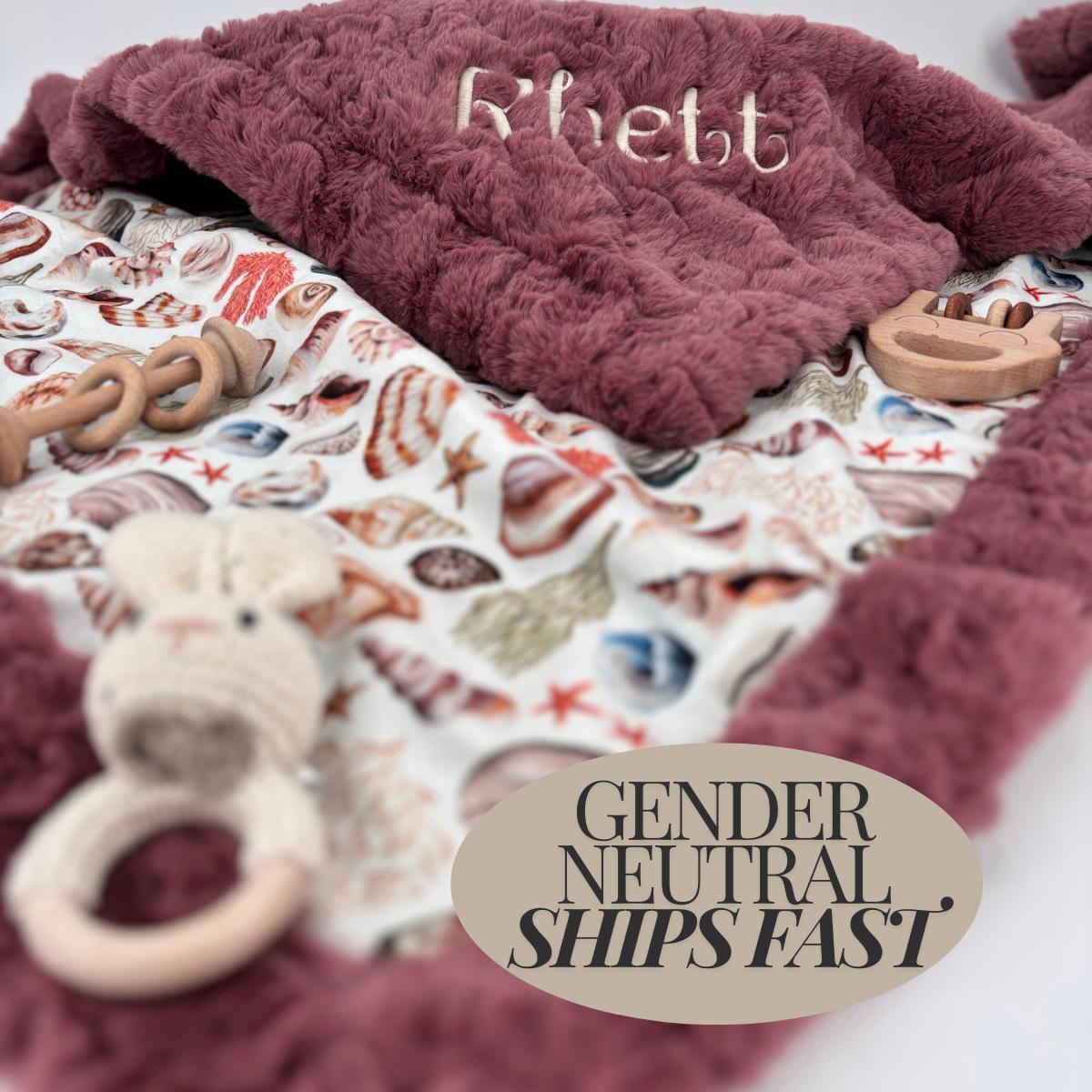 Personalized Coastal Blanket for Newborn gender Neutral Gift Idea Set Ocean Nursery Custom Name Embroidered Keepsake seashell theme Infant