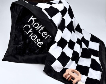 Personalized Bunny Blanket Baby Gift Nursery Accessory Custom Bedding Soft Fabric Satin Trim Ruffle Design Embroidered Name Newborn Wrap